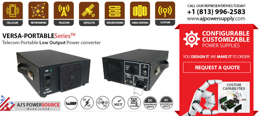 The VERSA-PORTABLE SeriesTM is a Telecom, Portable AC to DC and DC to DC Low Output Power Converter Designed for Equipment, Conferencing, Storage, Machines and more.