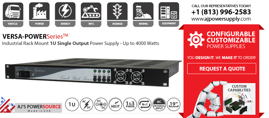 The VERSA-POWER SeriesTM is a 1U Power Supply that Provides up to 4000 Watts in a Single Output. Standard Output voltages include 3.3V, 5V, 12V, 24V, 28V & 48V that can be adjusted to suit your need.